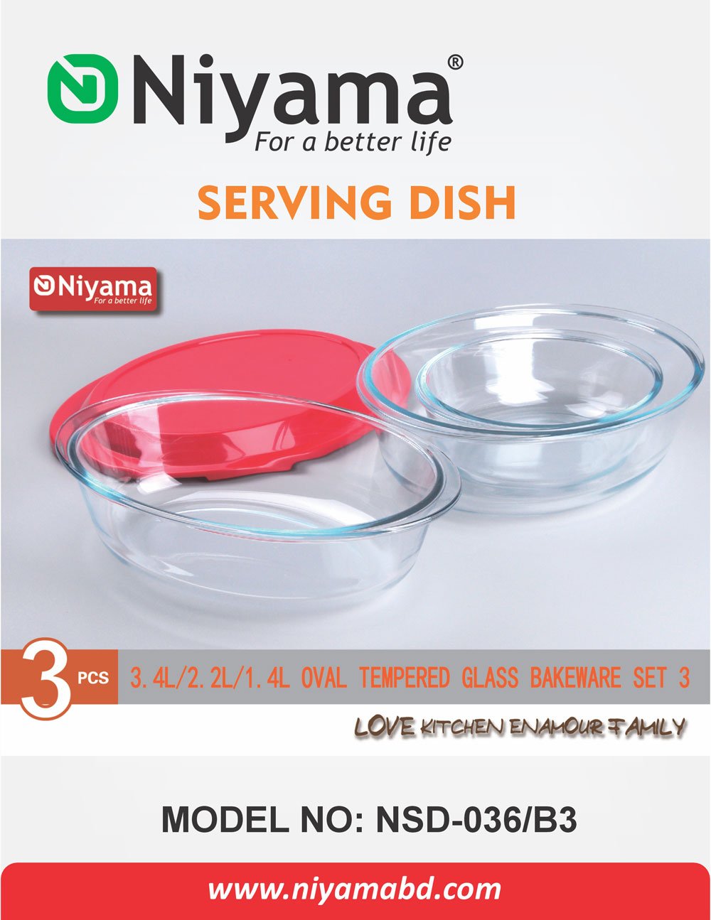 Enhance your kitchen experience with the Niyama NSD-036/B3 Oval Tempered Glass Bakeware Set. This premium 3-piece set offers durability, versatility, and effortless food preparation and serving.