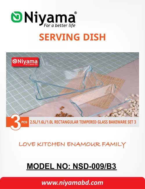 Upgrade your kitchenware collection with the Niyama Serving Dish Set NSD-009/B3. This elegant and durable 3-piece rectangular tempered glass bakeware set is perfect for everyday meals, special occasions, or gifting.